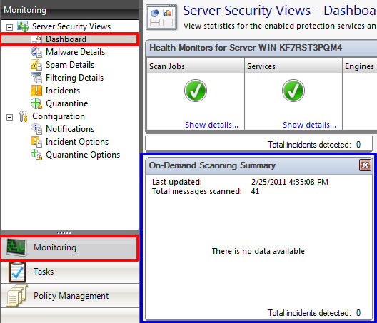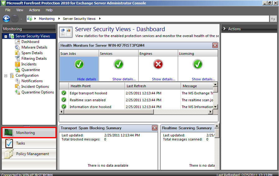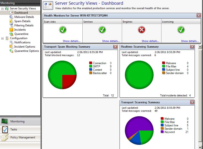 Bundan sonraki kısımda Forefront Protection 2010 For Exchange ürününden FFPE 2010 olarak bahsediyor olacağım. Kurulum işleminden sonra FFPE 2010 programını açtığımızda bizi Dashboard ekranı karşılar bu ekranda programın servisleri ve genel durumu hakkında bilgi ve veriler yer alır. Grafik arayüzlerin pencereleri şu anda hiçbir mail trafiği olmadığından grafiksizdir.Biz mail alış verişi yaptıkça bu ekranlarda değişecek yeri geldikçe bizde bu noktalara temas edeceğiz.Ürün genel olarak aşağıdaki anahatlardan meydana gelmektedir. Biz bunlara önem derecesine göre değinip açıklayacağız.