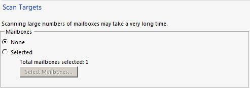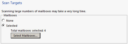 1-Biz örnek olması açısından bu ekranda gerekli ayarları yaparak bir tarama işlemi gerçekleştirelim.Bu işlemleri de resimler ile adım adım işleyelim. Öncelikle tarama işlemi için bir mailbox seçmemiz gerekmektedir. Bu nedenle None olan radio butonu Selected yapalım.
