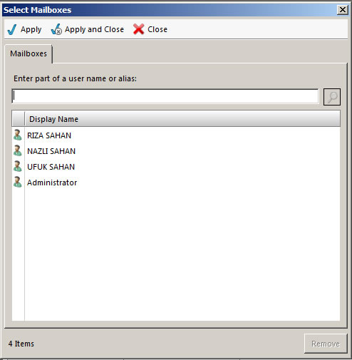 3-Açılan listeden gerekli taramanın yapılacağı kullanıcı mailboxını seçip Apply and Close butonu ile çıkalım.