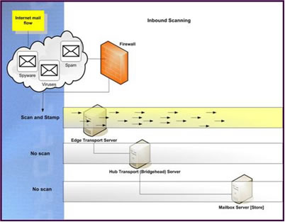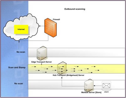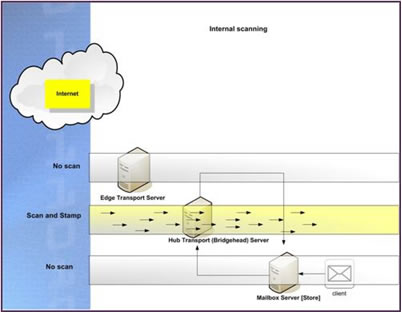1. Posta, güvenli olarak tanımlanan bir Hub Transport sunucusuna yönlendirilir ve zaman damgalı olarak Edge Transport sunucusu da taranır.