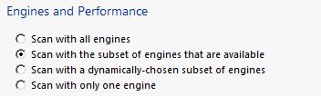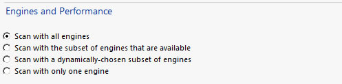 Engines and Performance kısmında tarama motorları ile ilgili ayarlar yapılmaktadır. Burada default olarak içeriğinde bu öğeleri tarayacak özelliğe sahip motorların seçimi yapılmıştır. Burada çalışma ortamımızdaki mimariye göre gereken seçimi yapabiliriz.