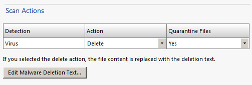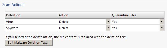 Scan actions kısmında bulunan virüs ve spyware ile ilgili bulunduğunda yapılacak işlem konusunda seçim yapılmaktadır. Bu ekranda bulunan öğe silinebilir, temizlenebilir, karantinaya alına bilir yada karantinaya alınmayabilir. Buradaki seçimler yine bizim mimarimiz kapsamında serbest seçime tabidir. Bu kısımdaki Edit Malware Delection Text… butonuna tıklatarak zararlı bir öğe bulunması durumunda kullanıcıya bununla ilgili dönecek olan bilgide yer alacak metinsel ifade yer almaktadır. Bu ifade default olabileceği gibi bizim değiştirdiğimiz şekilde oluşacak olan bir metinde olabilir.