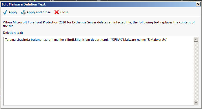 7-Edit Malware Deletion Text butonuna bastığımızda gelen ekranda ise zararlı içeriğin silinmesi durumunda kullanıcıya bizim belirleyeceğimiz içerikte bir mail gitmesini sağlayabiliriz.