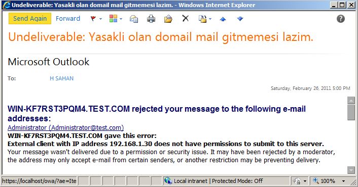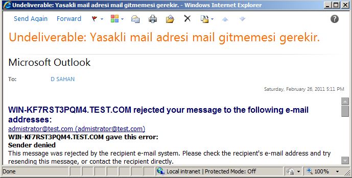 Resmimizde görüldüğü gibi mailimiz karşı tarafa iletilmedi karşı taraftaki adrese mail yollama iznimiz olmadığı için Sender denied hatası aldık.