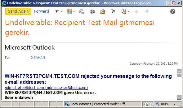 Resmimizde görüldüğü gibi unknown hatasını alıyoruz bu şekilde bir user olmadığı için mailin teslim edilemediği bilgisi bize ulaşmaktadır.