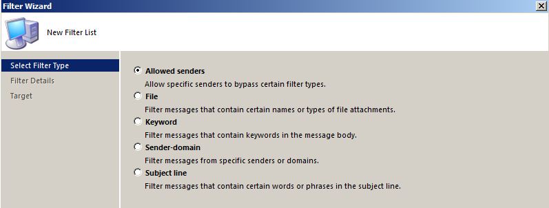 Fiter list : Bu ekranımızda tanımlanmış filtreler gözükmektedir. Yeni filtre ekleme var olan filtreyi editleme silme , filtrenin içeriğini özet halinde gösteren pencere bulunmaktadır. Bu alanda dosya uzantısı içeriği , mail içeriğindeki kelimeler gibi bir çok filtreleme yapabilmekteyiz. Bu alanda bir filtre tanımlama işlemi yaparak gerekli açıklamaları yapalım ve bu işlemimizi pekiştirelim.