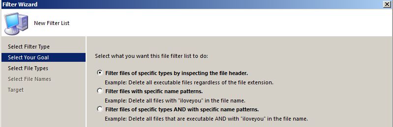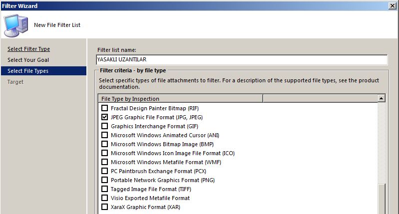 Farklı 3 seçenek bulunmaktadır bunlar bizim varolan Microsoft tarafından tanımlanmış uzantıları seçebileceğimiz, kendimizin uzantı tanımlayabileceği ve Microsoft tarafınsan tanımlanmış olan içeriklere bizimde ekleme yaparak seçebileceğimiz sistemdir. Microsoft neredeyse tüm uzantıları sistem dahil ettiği için ben ilk seçenek olan Filters files specific type by inspecting the file header seçeneği ile ilerliyorum.