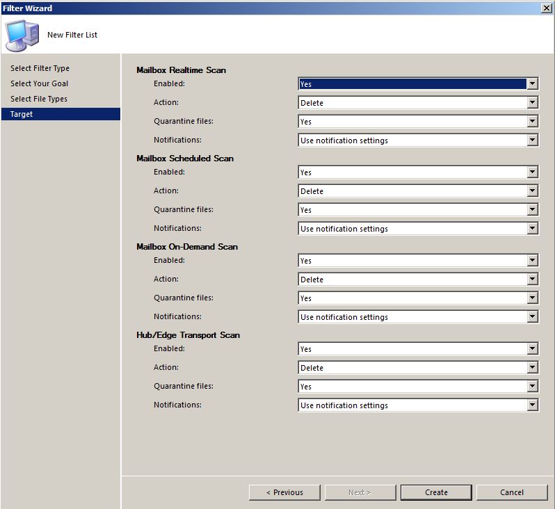 Bu ekranda içeriğimiz hangi role üzerinde ve hangi taramada bulunursa ne yapılması gerektiği noktasındaki adımları belirliyorum. Şu anda bir mailde jpg uzantılı ek bulunması durumunda kurallarım açık ,bulunan içerik silinecek, aynı zamanda karantinaya alınacak , mail atılan kişiye bir uyarı gidecek. Create butonu ile filtre tanımlama adımlarımı sonlandırıyorum.