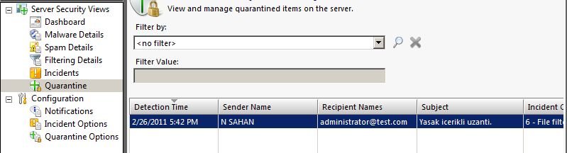Kuralımızı tanımlarken aynı zamanda bu öğenin karantinaya alınması gerektiğini belirtmiştik. Karantina alanına gittiğimizde bu mailin kopyasının karantinaya alındığını görüyoruz. Olurda mailin gittiği kişiye bu uzantı gerekli olur ve olmazsa olmaz bir durum vardır bu durumda karantinadaki öğenin üstüne sağ tıklatıp Save diyerek mail içeriğindeki uzantıyı belirtilen path üzerine kaydedip kullanıcıya verebiliriz.