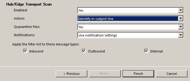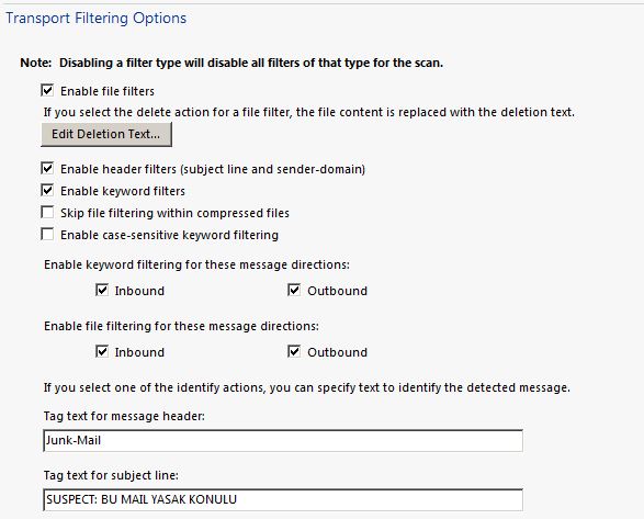 Bu ayar bölmesinde transport rol üzerinde filtreleme yapıldığında filtreleme sonucunda silinme actionu uygulandığında silme sırasında karşı bildirim txt dosyası içerisinde hangi metnin olacağını belirleyebilir kendi mimarimiz doğrultusunda yapılandırabiliriz. Burada gerçek zamanlı filtrelemeyi , konuya eklenecek olan metin bilgisini ve sıkıştırılmış dosyaların taranmasını devre dışı bırakabiliriz. Bu filtreleme tipinin inbound outbound trafik üzerinde açık olup olmaması konusunda ayarlama yapabiliriz. Yukarıda yaptığımız keyworks testinde mail headerine eklenecek olan bilgiyi buradaki Tag Text for Subject Line bölmesine yazarak ayarlayabilir, Mail header bilgisinide buradan belirleyebiliriz.