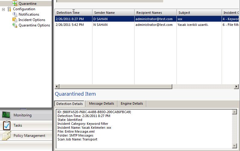 Quarantina : Bu alanda programda yapılan ayarlar ve uygulanan filtrelerde yapılan ayarlar doğrultusunda karantinaya alınan öğeler ile ilgili istediğimiz kriterlerde süzdürme işlemleri yaparak istediğimiz raporları elde edebiliriz. Bu alan Incıdents alanı ile aynı özellikleri karşılar gibi görünmesine karşın karantinaya alınan öğeleri içeren raporlar sunmaktadır.
