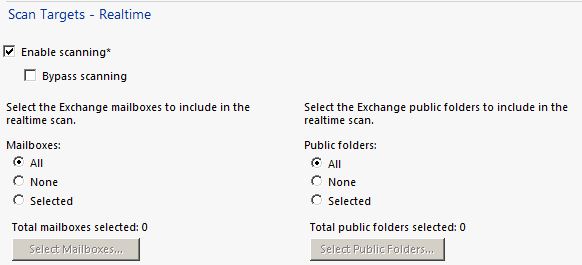 Bu ekranımızda gerçek zamanlı tarama sırasında taramanın açık olup olmayacağı, taramanın tüm mailboz yada public folderi kapsayıp kapsamayacağı ,taramanın olmayacağı veya belli bir mailbox veya public foldere yapılacağı şeklinde ayarlar yapılmaktadır. Default olarak tüm mailbox ve public folderlere taranacak şeklinde ayarlı gelmektedir genel olarak olması gereken budur. Özelleştirmeye açıktır.