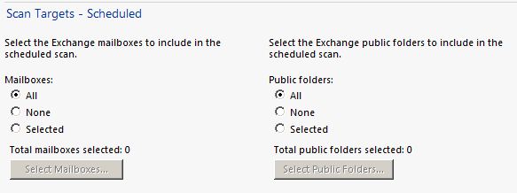 Bu ekranımızda zamanlanmış tarama var ise taramanın açık olup olmayacağı, taramanın tüm mailbox yada public folderi kapsayıp kapsamayacağı ,taramanın olmayacağı veya belli bir mailbox veya public foldere yapılacağı şeklinde ayarlar yapılmaktadır. Default olarak tüm mailbox ve public folderlere taranacak şeklinde ayarlı gelmektedir genel olarak olması gereken budur. Özelleştirmeye açıktır.