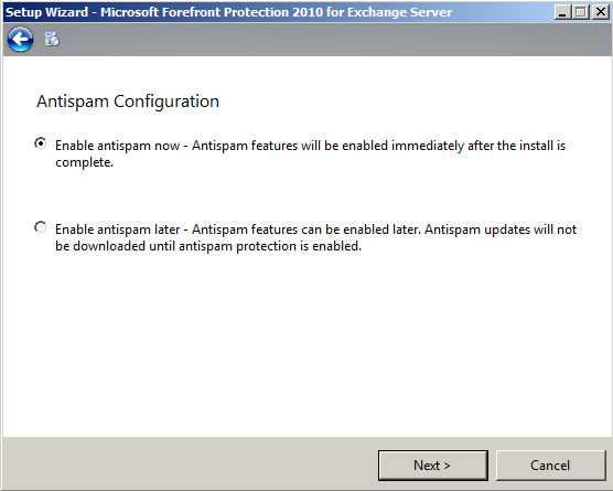 6-Bu ekranda kurulum ile birlikte AntiSpam özelliğinin enable edilip edilmemesi konusunda seçim yaparak Next ile ilerliyoruz.