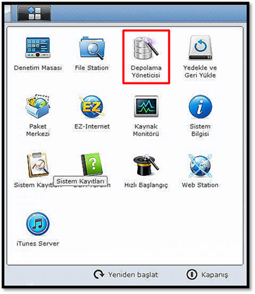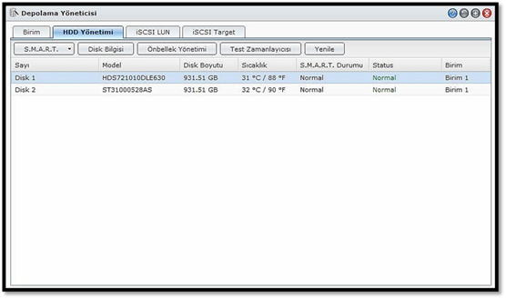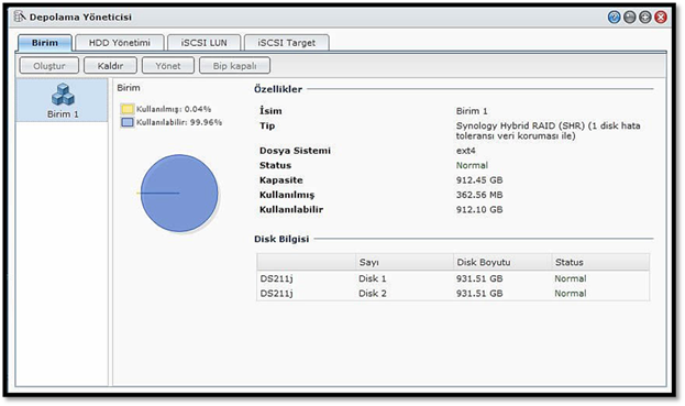 Depolama Yöneticisi ekranına daha önce değinmiştik burada cihaz üzerinde oluşturulan disk birimlerine erişim sağlamakta ve yapılandırma işlemlerinde bulunabilmekteyiz.