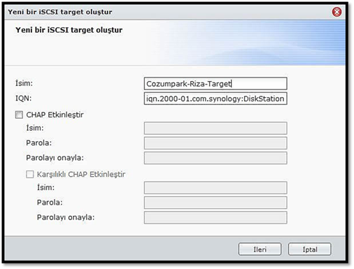ISCSI Target alanımızda yine tanımlama olmadığı için burası boş gelmektedir. Bu makalemizin konusu olan kısımlar sistem uzmanları tarafından kullanılıyor olmasına karşın Çözümpark Bilişim Sözlüğünde yer aldığı gibi bu terimlerimizi açıklayalım.
