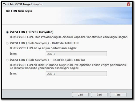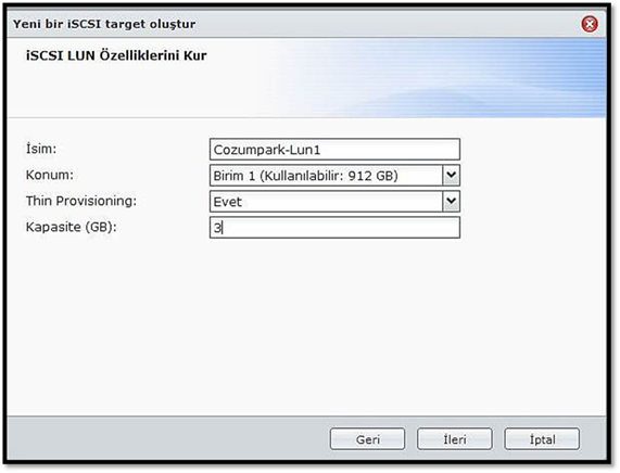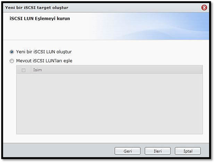 Target oluştuktan sonra var olan bir Lun’u target’a bağlayabileceğimiz gibi yeni bir Lun tanımlaması da yapabiliriz. Bizim elimizde hali hazırda bir Lun olmadığından “Yeni bir ISCSI Lun Oluştur” seçeneğini seçili bırakarak İleri butonu ile ilerliyoruz.