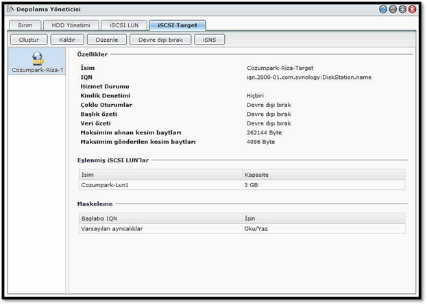 Yaptığımız işlemlerin bir özeti sunulmaktadır. Uygula butonu ile ISCSI Target ve bu Target’a ait olan Lun tanımlama işlemlerinin tamamlanmasını sağlıyoruz.