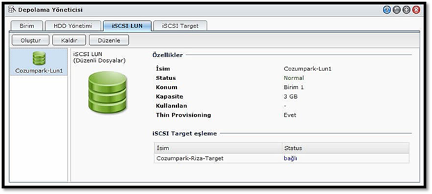 ISCSI-Lun ekranımızda yer aldığı gibi Lun yapımızda oluştu.