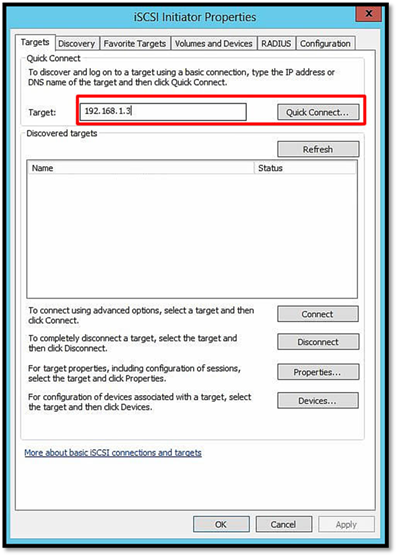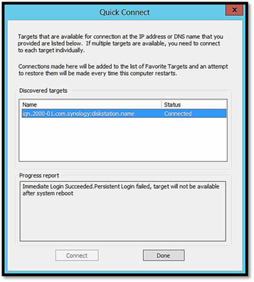 Bu aşamada Target ve Lun oluştuğuna göre bunların bir ortamda kullanılması aşamasına geldik. Bir çok işletim sistemi ve server işletim sisteminde ISCSI yapısı ile haberleşme için protokol bulunmaktadır. Windows server işletim sistemlerinde kullanılan program ISCSI Initator yazılımıdır. Windows Server üzerinde bu özellik daha önceleri Rol kısmından kurulum yapılıp aktif edilirken son yıllarda kendi kurulu olarak bize sunulmaya başlandı. Bizim test işlemimizde kullanılacak olan yapımızda bulunan Server 2012 işletim sistemimizde bu özellik var olduğu için direkt olarak programımızı açalım. Açılan ekranımızda Target ip adresi olarak Synology Nas cihazımızın ip adresini girelim ve “Quick Connect” butonuna tıklayalım.