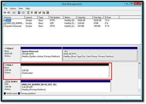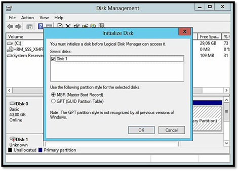 Server işletim sistemimiz üzerinde Disk Management ekranımızı açtığımızda direkt olarak bu diskimizin bulunduğu bilgisi bize verilmektedir. OK ile bunu onaylayalım.