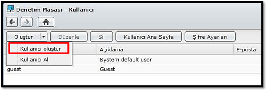 “Oluştur” butonu altında yer alan “Kullanıcı Oluştur” butonuna tıklayalım. Dış ortamlardan kullanıcı import etme imkanına sahibiz. Bunu “Kullanıcı Al” kısmında görebiliyoruz.