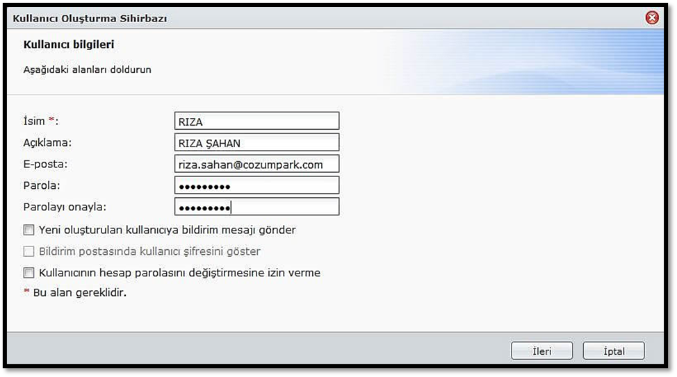 Gelen ekranımızda kullanıcı adı, açıklama mail ve şifre bilgisini girelim. Bu kullanıcıya mail attırma imkanımız var fakat biz mail ayarlarımızı ilerleyen adımlarda ele alacağız bu nedenle bu adımı şimdi pas geçiyoruz. Zaten bu adım olmasa da sorun değil. Bu aşamadan sonra “İleri” butonuna tıklayalım.