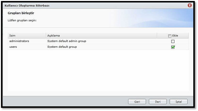 Bu ekranımızda eğer ortamımızda daha önce kullanıcı yerine grup oluşturulmuş ise direk kullanıcıyı bir gruba atayabiliriz. Varsayılan olarak administrator grubu tanımlanmış durumda fakat biz kullanıcımızı gruba atama işlemi yapmıyoruz. Bu işlemi daha sonra grup oluşturma aşamasında göreceğiz. “İleri” butonu ile bir sonraki ekrana ilerleyelim.