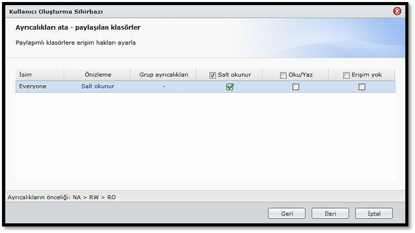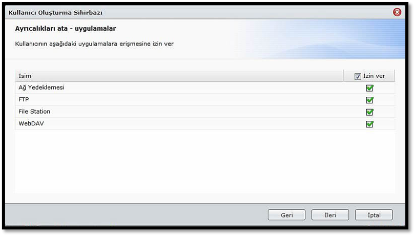 Hali hazırda var olan klasörlere oluşturulacak kullanıcı için hak verebilir veya vermeyebiliriz. Ben örnek olması açısından hak veriyorum. “İleri” ile sonraki ekrana geçelim.