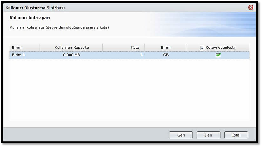 Kullanıcının yetkilendirildiği klasöre kota uygulaması yapabiliriz. Örnek olması açısından 1 Gb kota verip bir sonraki ekrana “İleri” ile ileryelelim.