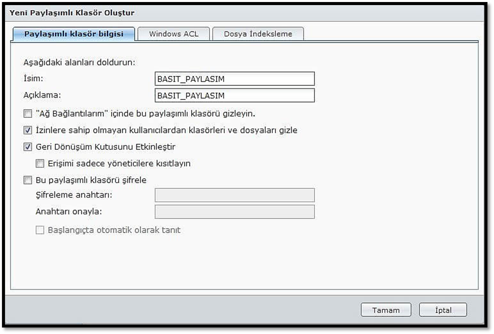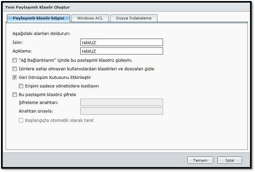 Açılan ekranda klasörümüze isim verelim. “Geri Dönüşüm Kutusunu Etkinleştir” seçeneği ile silinen öğeleri geri alabilmek için ayarımızı yapalım.