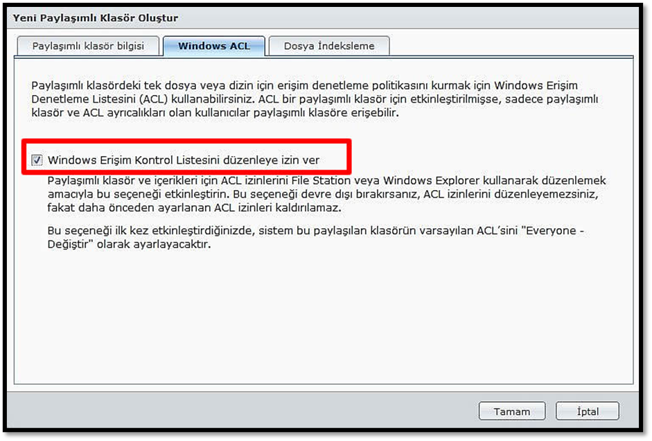 Üst tabda yer alan Windows ACL özelliği ile klasik yetkilendirmeleri pas geçerek DSM cihazımıza ait yetkilendirme özelliklerini aktif edelim. Bu özellik aktif olmazsa yaz/oku/erişim yok gibi klasik yetkilendirme dışında ayar yapamayız.