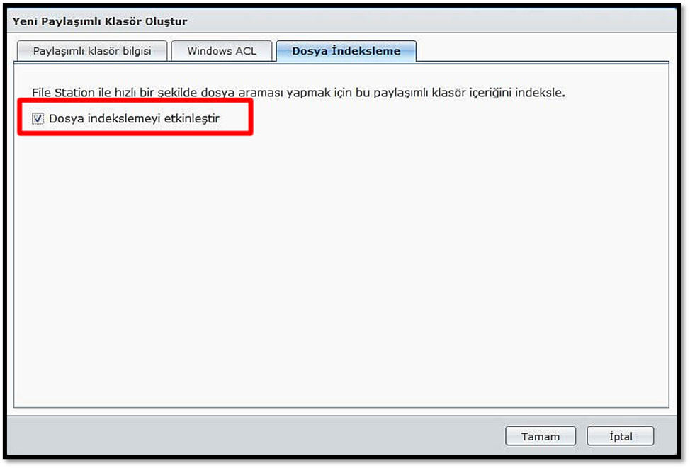 Son tab olan Dosya İndeklemesi özelliği ile büyük verilerde hızlı erişim imkanımız olacağından ve hızlı arama yapılacağından bu seçimi de işaretleyelim.
