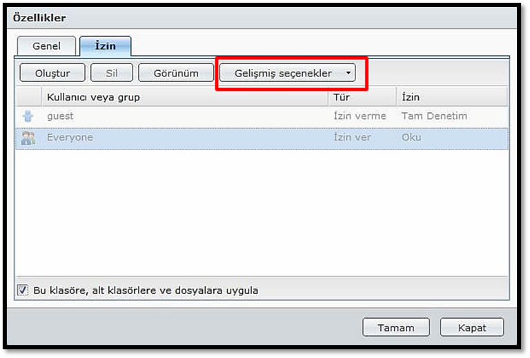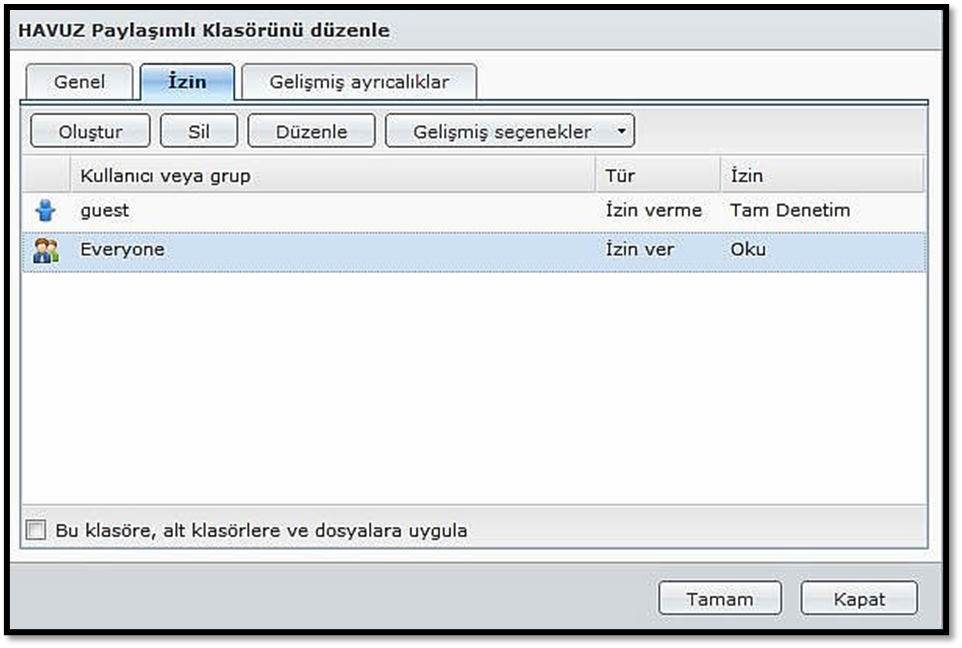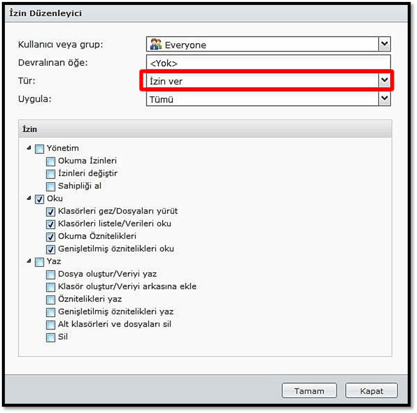 Everyone grubuna “İzin Ver” seçeneği ile aşağıdaki seçimlere izin verme yetkisi sağlayalım. Bu klasörümüze aşağıda olduğu gibi sadece okuma özelliğini aktif edelim.