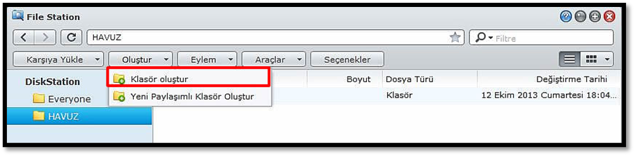Bu üst klasörümüzün altında sade bir klasör oluşturalım. Bu nedenle “Oluştur” butonu altında yer alan “Klasör Oluştur” kısmına tıklayalım.