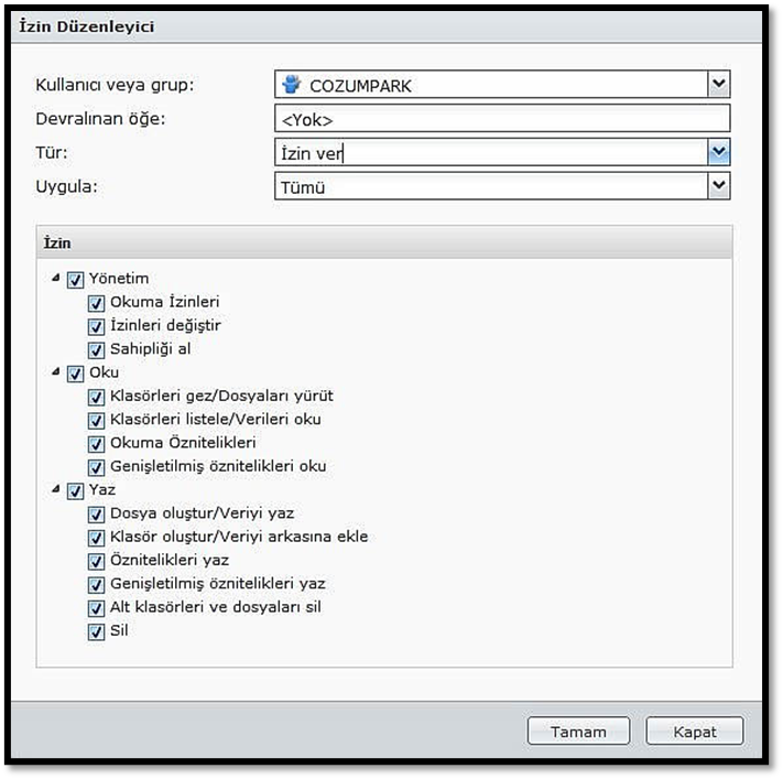 Öncelikle “COZUMPARK” grubumuzu seçelim ve bu gruba tam yetki verelim.