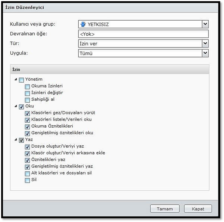 “YETKISIZ” grubumuza yine tam yetki fakat silme hakkı vermeyelim. Görüldüğü gibi izinlerimiz çok esnek bu bize şirket ortamında büyük artılar kazandıracaktır.