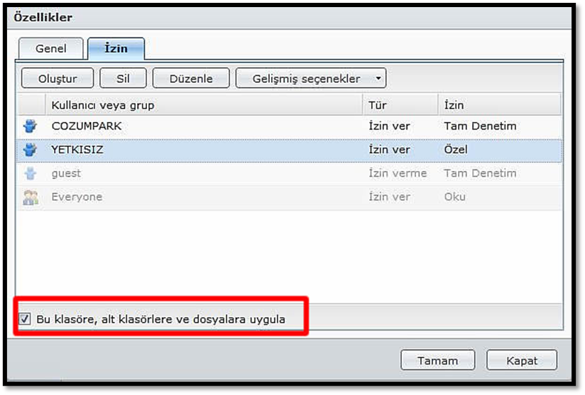 “Bu klasöre, alt klasörlere ve dosyalara uygula” seçeneğini işaretleyerek altta oluşacak olan tüm dosya ve klasörlere bu yetkilendirmelerden etkilenme işlemini yapalım.