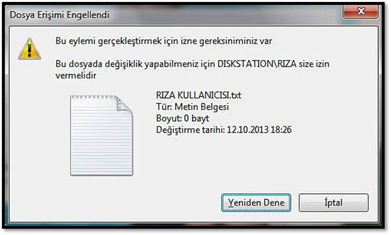 Görüldüğü gibi dosyamızı silemedik. İzinlerimizin ne kadar işlevsel ve esnek olduğunu görebiliyoruz.
