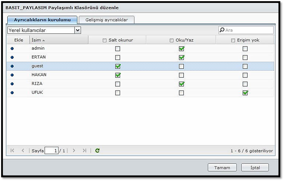Üst tabda yer alan Windows ACL özelliğini işaretlemediğimiz için “Tamam” butonuna basmamız ile birlikte direkt olarak bir sonraki ekranda karşımıza basit paylaşım hakları geldi. Dilediğimiz kullanıcı ve gruba buradan basit yetkilendirme yapabiliriz.