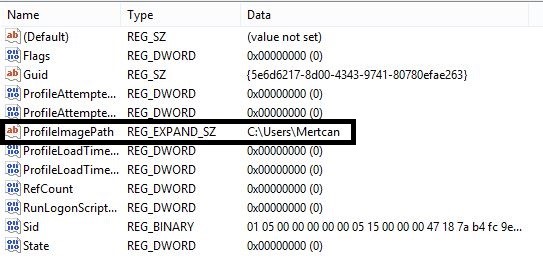 Bu lokasyona gittiğinizde kullanıcı kayıtlarını göreceksiniz. S-1-5-18, S-1-5-19, S-1-5-20 olanlara kesinlikle bir işlem yapmıyoruz.