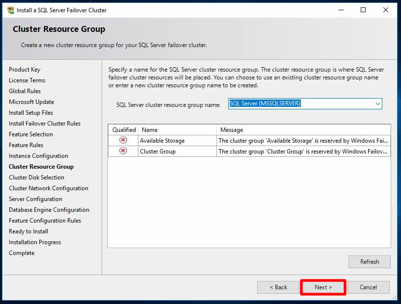 SQL Server cluster resource group name alanında SQL server group name bilgisini görebilmekteyiz. Bu ekranda ek bir ayar yapmadan Next ile sonraki adıma ilerliyoruz.