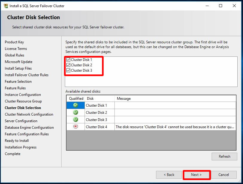 Bu ekranımızda ise cluster ortamında kullanılabilen diskler listelenmekte. Ben yapılandırmamda üç disk kullanacağım ve dördüncü diskim qourum diski olduğu için bunları seçiyorum ve Next ile sonraki adıma ilerliyorum.