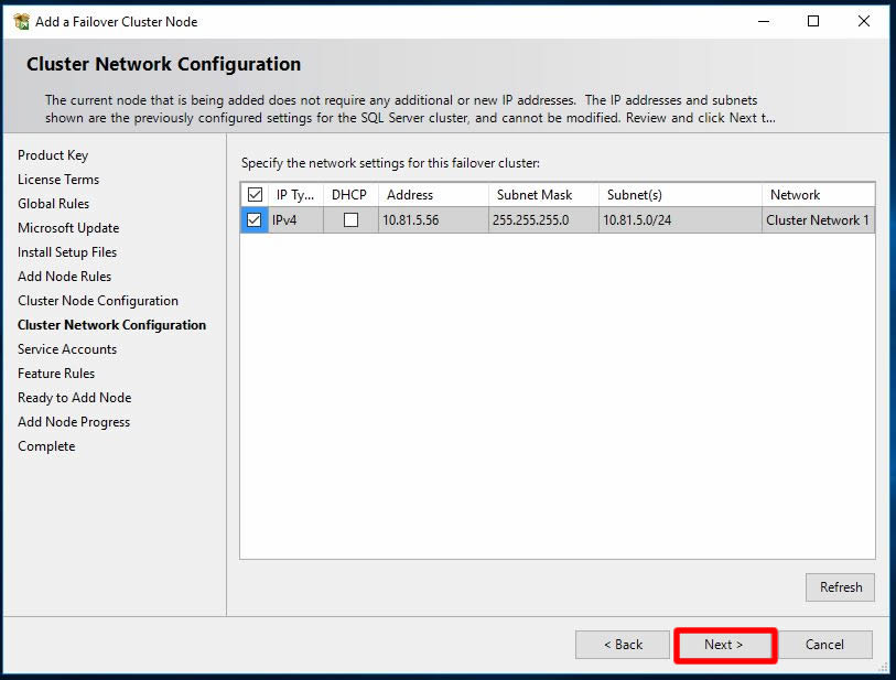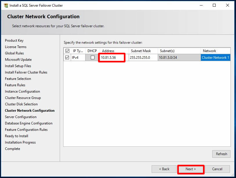 Bu ekranımızda ise SQL cluster mimarisi için bir ip adresi belirlememiz gerekmekte. Mevcut networkümüzden 10.81.5.X bloğundan bir ip adresi belirleyip Next ile ilerliyorum.