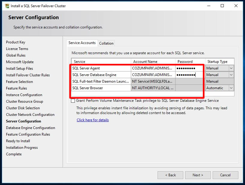 Bu ekranımızda SQL server üzerinde kullanılacak olan servis hesaplarını belirlememiz gerekmekte. En ideal yöntem AD üzerinde bu işlem için bir hesap açmak ancak biz labaratuvar ortamında olduğumuz için ben Domain Admin kullanıcı hesap bilgilerimi girerek Next ile ilerliyorum.