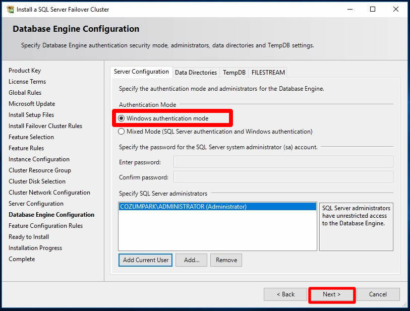 Server Configuration tabımızda authentication seçimini belirlememiz gerekmekte. Burada Windows ve SQL authentication yöntemini veya ikisini bir arada seçmemiz mümkün. Ben mevcut seçimi kullanmak istediğim için Add Current User butonuna tıklıyorum.