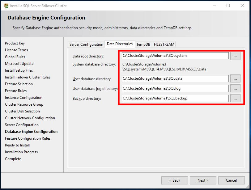 Data Directories tabında ise SQL Cluster ortamı kurduğumuz için ortak alan üzerindeki yolları belirlememiz gerekiyor. Cluster Disklerimiz üzerinde Database, Log, tempdb ve backup yollarını tanımlıyorum.