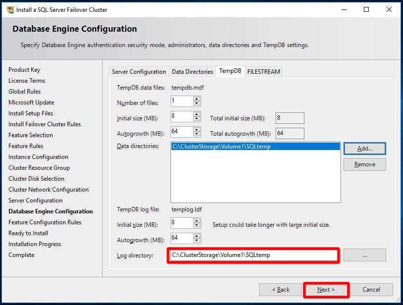 Yine TempDb tabında temp database alanı için yol belirlemesi yapıp Next ile ilerliyoruz.