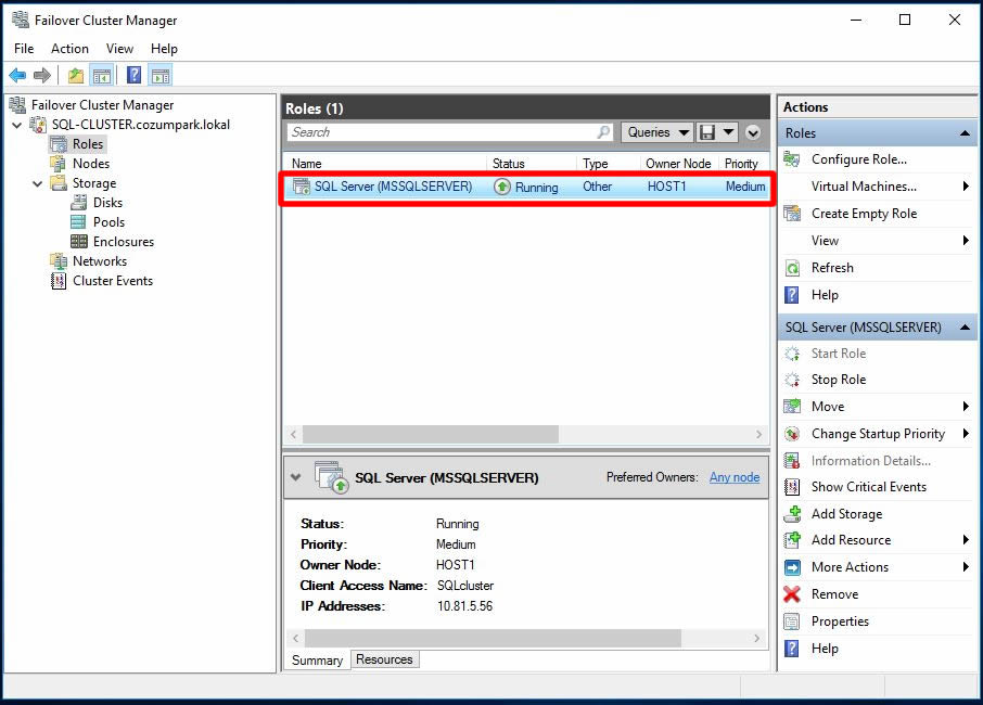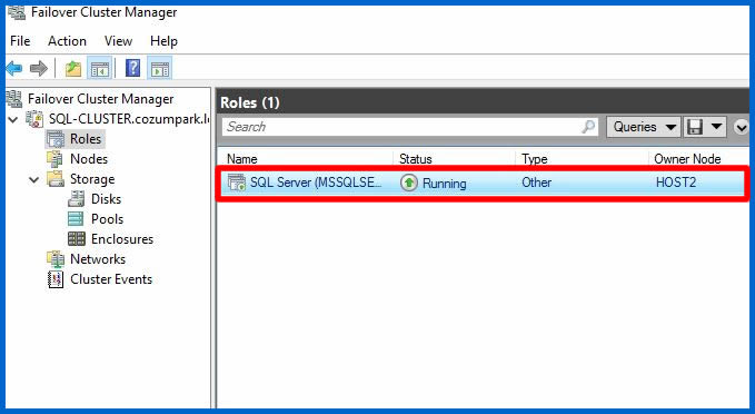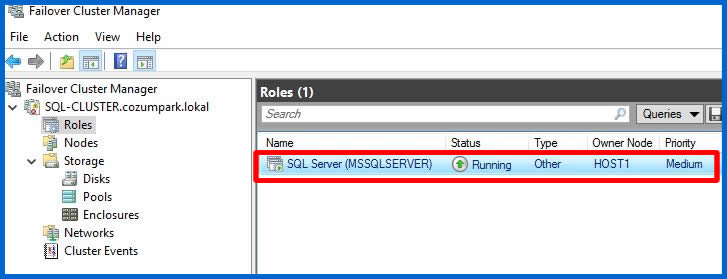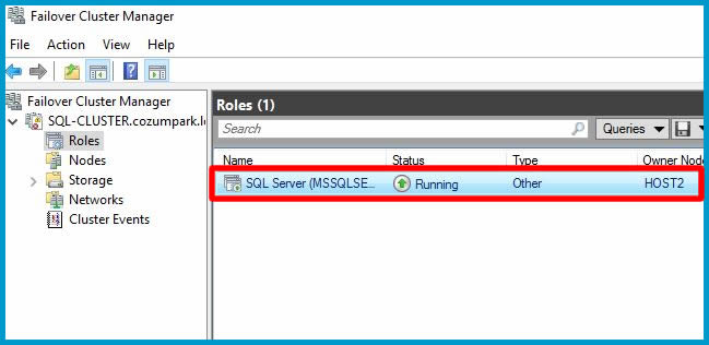 Cluster Role ekranımızda SQL Server rolümüzün eklendiği görülmekte.