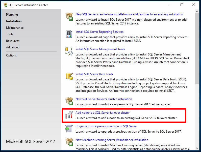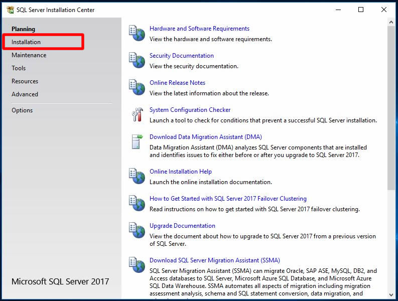 Klasik SQL kurma, kaldırma, cluster kurulumu, node ekleme, yardım ve yapılandırma kısa yollarının olduğu ekranda Installation linkine tıklayalım.